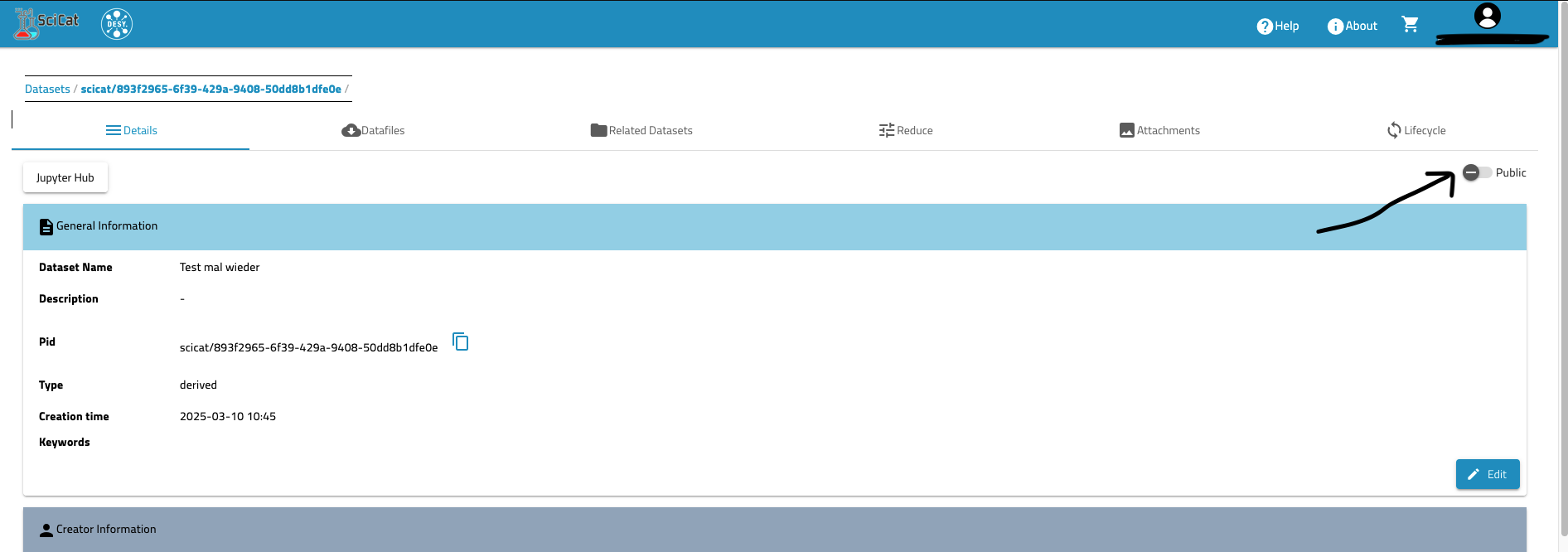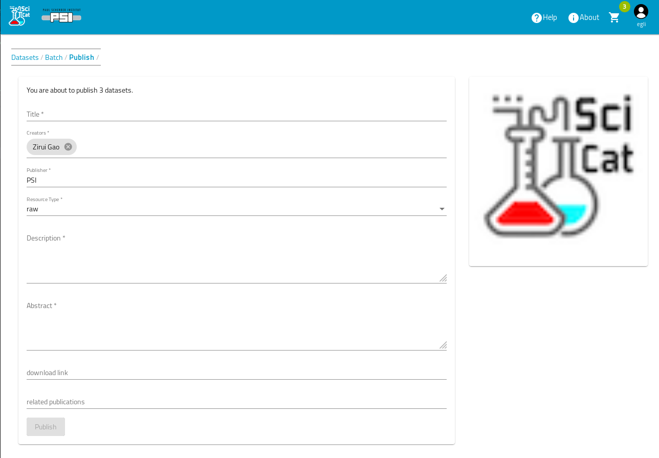There are two ways of publishing datasets in SciCat via the GUI: one using the "publish button" for each dataset, and the other when registering a selection of datasets for a DOI according to DataCite standards. The first step is included in the second one. If you want a more advanced option for full exploitation of the available endpoints of SciCat, see here.