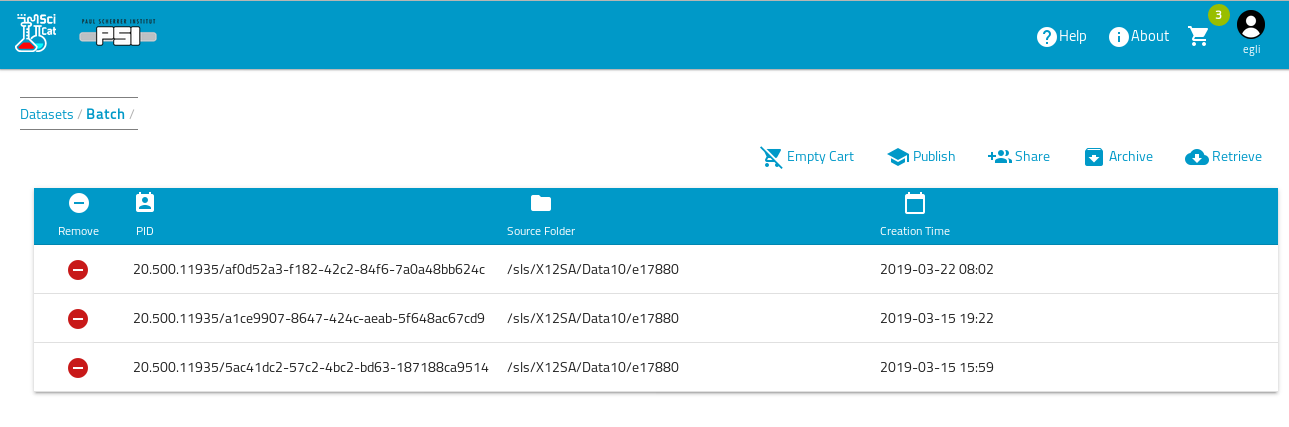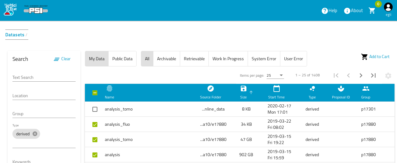 Then by hitting the "Add to Cart" button these datasets are available in the Cart. This step can be repeated to add further datasets. Once the selection is finished you open the Cart ( click on the Cart symbol and choose actions ) to see the selected datasets: