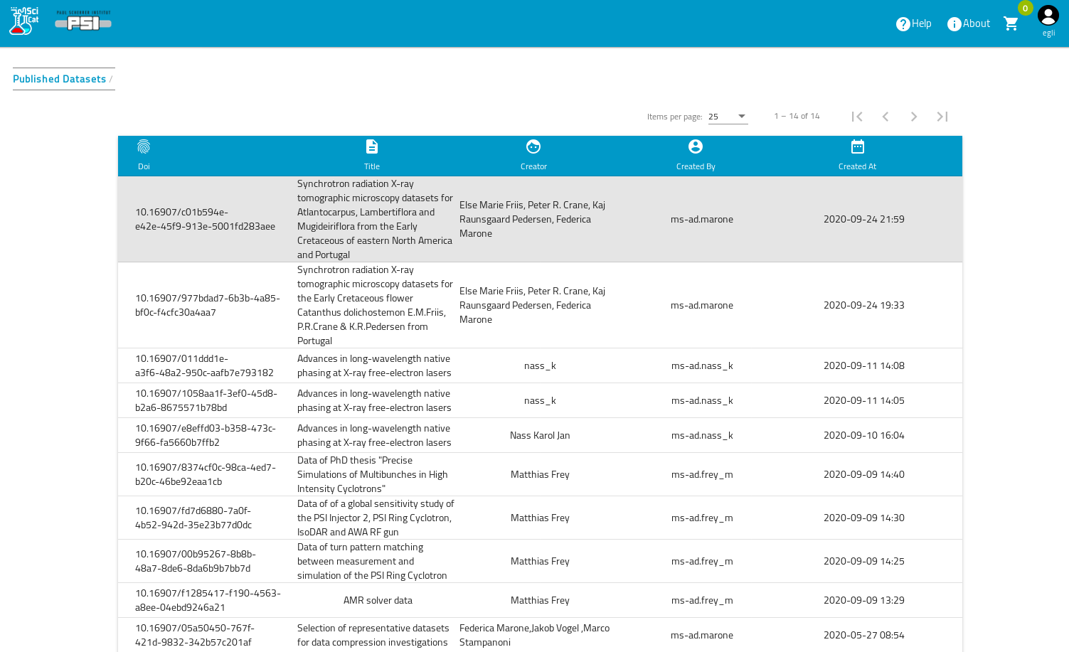 Finally you can have a look at all the published data by going to the Published Data menu item: by clicking the user icon at the top right corner and choosing "Published Data":