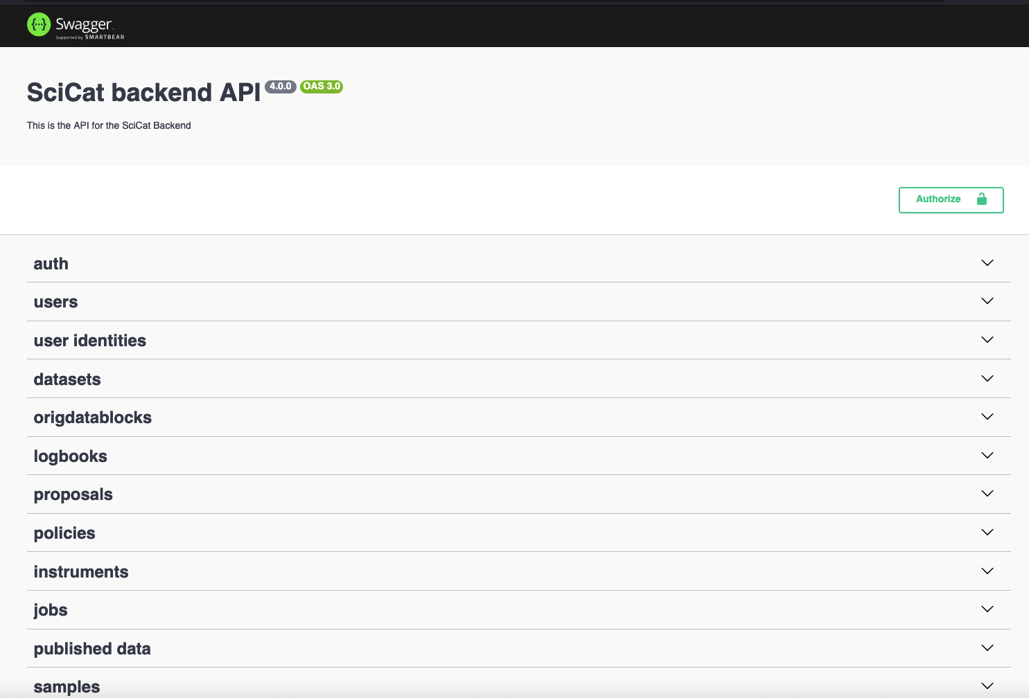 If SciCat has been set up and runs, one has direct access to the backend through the APIs via the Swagger tool or Explorer interface. Often, you can simply extend the url by /explorer, e.g. https://myscicat.mydomain.de/explorer. You will see a list of all APIs of that instance.