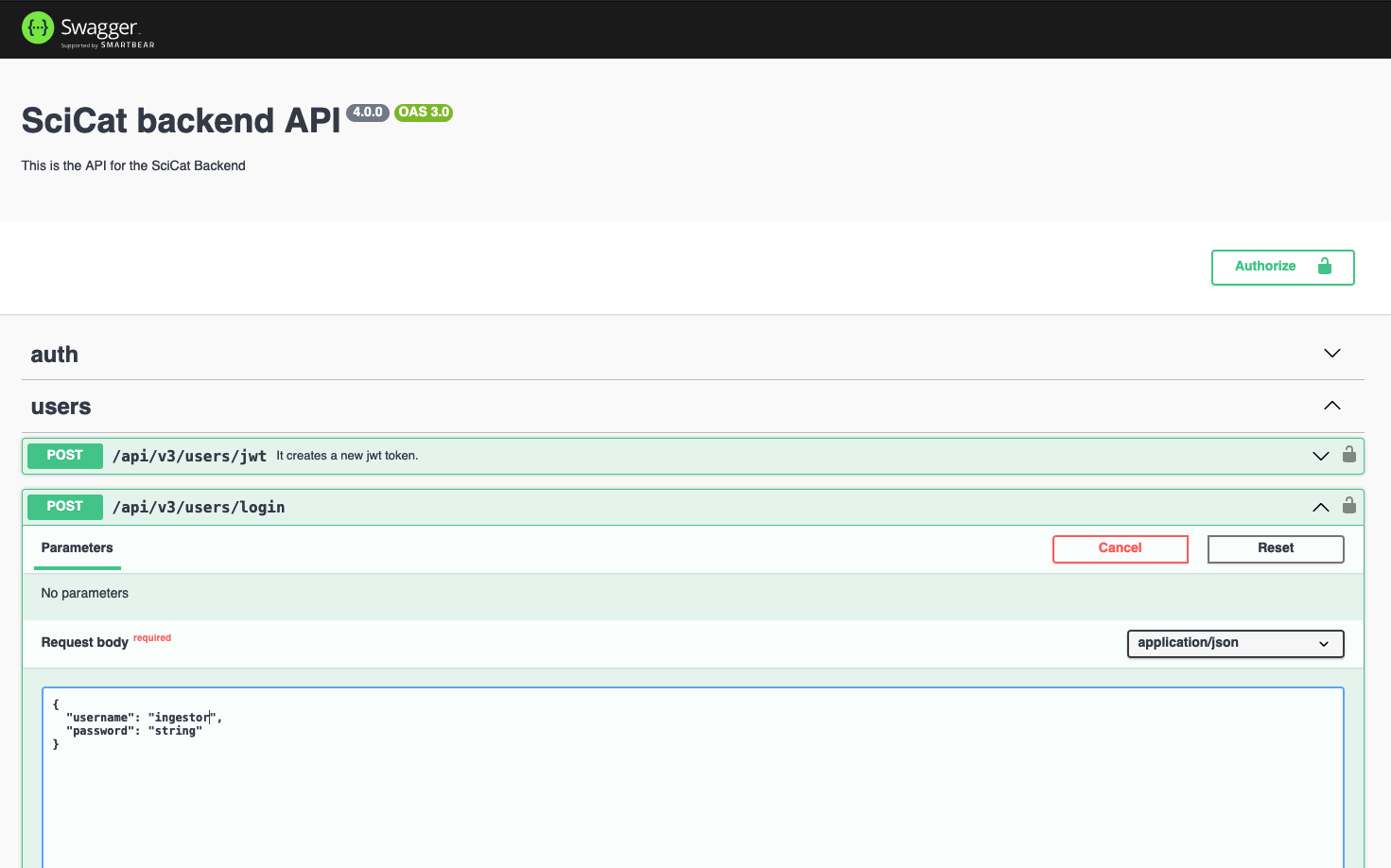 1. Get the SciCat token from the user setting when logged into SciCat via the main GUI. Copy paste it into the field "Authorize" in the explorer on the top right.